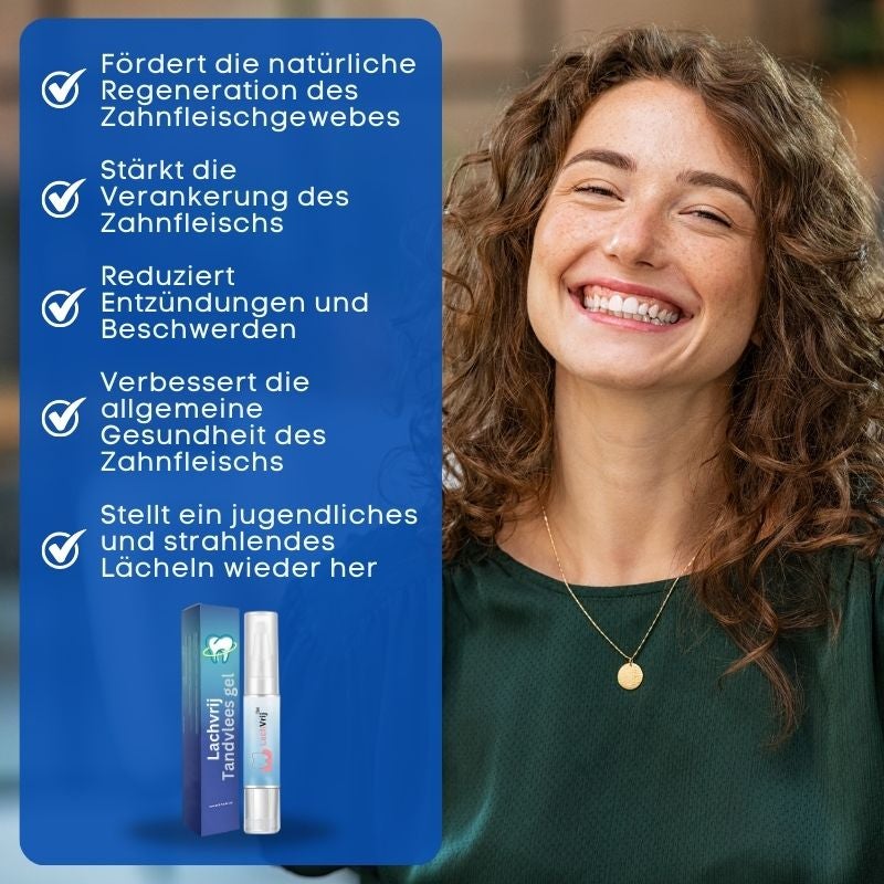 "Ich hatte starke Probleme mit zurückgehendem Zahnfleisch und traute mich nicht mehr zu lachen. Nach nur ein paar Tagen Anwendung dieses Gels war mein Zahnfleisch regeneriert. Mein Lächeln ist wieder wunderschön, und ich fühle mich selbstbewusst!"
